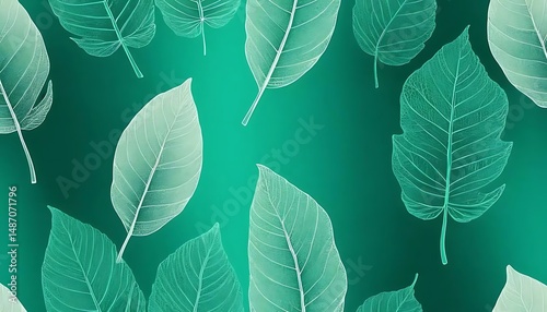 Obraz premium Translucent skeletal leaf silhouettes float on a teal gradient for an airy,...