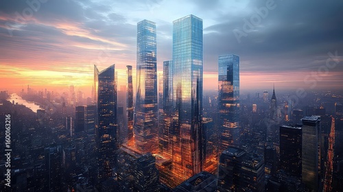 Fototapeta premium Translucent skyscraper designs showcasing futuristic glass facades, layered light diffusion, energy-saving technologies, sleek urban silhouettes, and innovative daylight-optimized interiors.