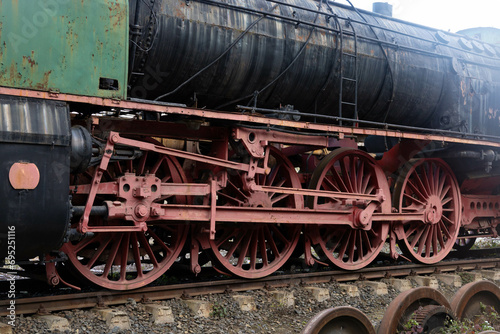 Naklejka premium Transmission system of an old train. Traction wheels of a steam train