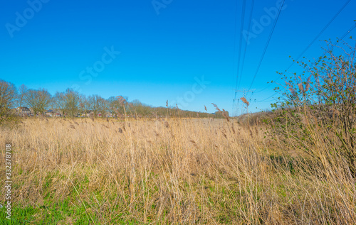 © Naj, Obraz premium Transmission tower over an agricultural field below a blue sky in spring