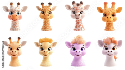 © Anastasiia, Fototapeta premium transparent background, isolated image. Colorful cartoon giraffe characters with cheerful expressions, showcasing various designs and styles, perfect for children's illustrations and playful themes