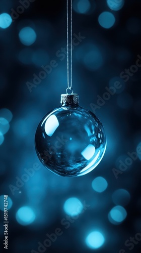 © Dace, Fototapeta premium Transparent blue christmas ornament hanging with sparkling bokeh background