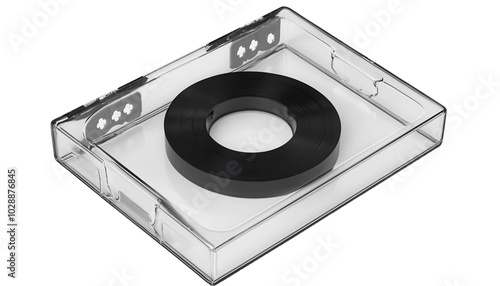 Fototapeta premium Transparent cassette tape case with a black cassette inside, isolated on transparent background.