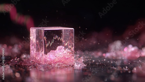 Fototapeta premium Transparent cube, stock chart, pink crystals