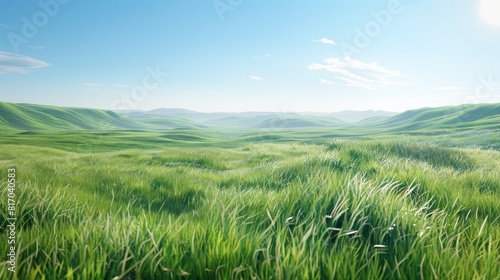 Fototapeta premium Transparent 3D grass in a serene field setting, with rolling hills and a clear blue sky in the background, emphasizing natural beauty