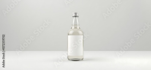 © Natalya, Obraz premium Transparent glass bottle with an empty label on a light gray background in a minimalist style