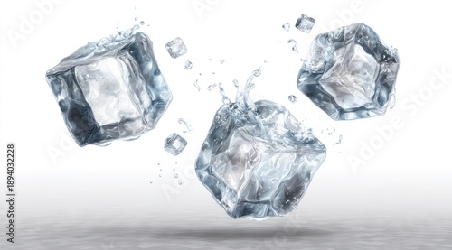 © alif, Obraz premium Transparent ice cubes suspended in air with water splashes against a white backdrop