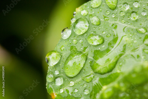 © Nopanan, Fototapeta premium Transparent water droplets on green leaves