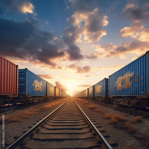 © Daranrat, Fototapeta premium transport containers on a freight train realistic land