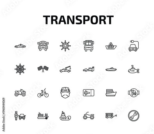 © Farahim, Fototapeta premium transport outline icon set. 24 linear vector for ui, web and mobile. thin line patrol car, school bus empty, ship wheel and more icons.