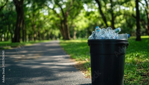Fototapeta premium Trash can overflowing with plastic bottles in park