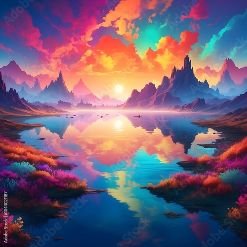 © lavillia, Obraz premium Traumhafter See mit Bergen im Hintergrund - Surreale Farben