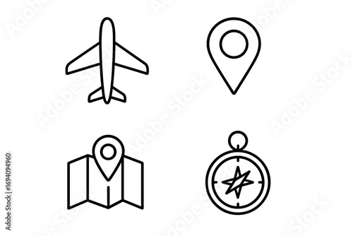 Fototapeta premium Travel and navigation line icon set. Plane, map pin, compass, and location marker symbols. Vector outline pictogram for tourism, web design, apps, and adventure concepts.
