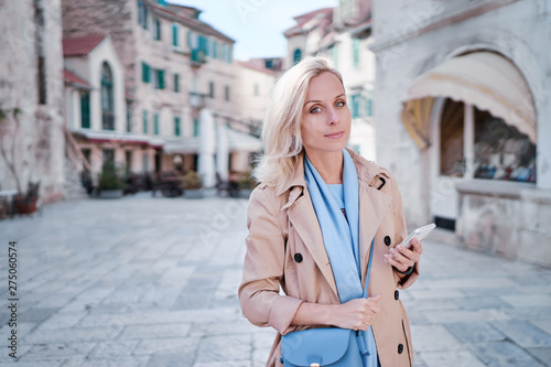 © luengo_ua, Fototapeta premium Travel and technology. Happy young woman in coat using smartphone walking by Split Old Town.