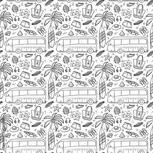 Fototapeta premium Travel and vacation seamless pattern with travel elements. Seamless pattern for design, posters, backgrounds vacation and trip theme. Bus, palm and beach elements in line style.