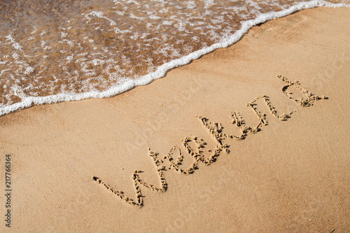 © smspsy, Fototapeta premium travel background with waves of sea, beach and word weekend