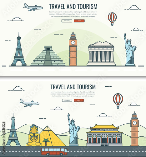 © switchpipi, Fototapeta premium Travel composition with world landmarks and travel equipment. Travel and Tourism. Concept website template. Vector