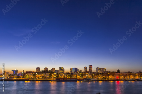 © danmorgan12, Obraz premium Travel Concepts and Ideas. Beautiful and Astonishing View of Rotterdam Skyline at Blue Hour Time.