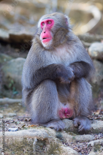 © danmorgan12, Naklejka premium Travel Destinations. Japanese Macaque Near Tree at Arashiyama Monkey Park Iwatayama in Kyoto, Japan.