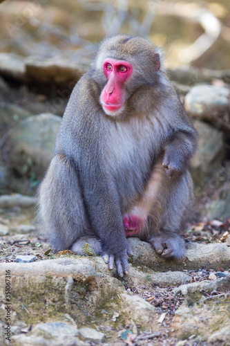 © danmorgan12, Naklejka premium Travel Destinations. Japanese Macaque Near Tree at Arashiyama Monkey Park Iwatayama in Kyoto, Japan.
