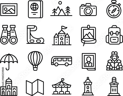 Naklejka premium Travel icons, adventure symbols, passport, camera, compass, binoculars, castle, hiking gear, backpack, hot air balloon, bus,