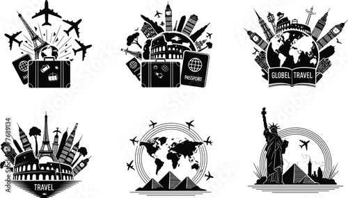 © Rifat Creatives, Fototapeta premium Travel illustration collage, famous landmarks sketch, world map art, suitcase design, global tourism icons, airplane drawing, passport elements, cultural heritage, vacation concept