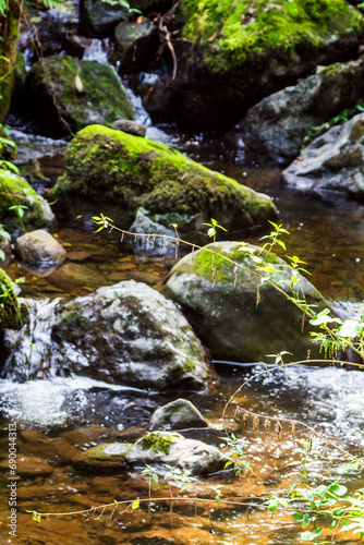 © vvoe, Fototapeta premium travel to Georgia - stalks of grass illuminated by sun against background of boulders and water in mountain stream in Mirveti village in Adjara on sunny autumn day
