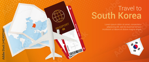 Obraz premium Travel to South Korea pop-under banner. Trip banner with passport, tickets, airplane, boarding pass, map and flag of South Korea.