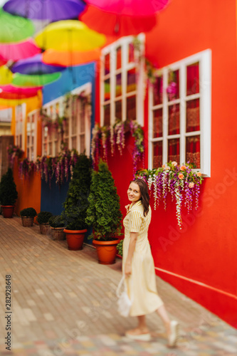 Obraz premium Travel tourist brunette woman in yellow dress walks the streets with bright...