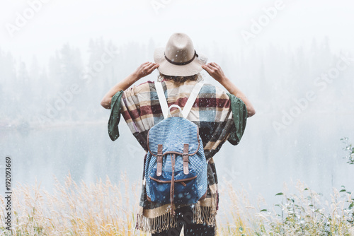 Fototapeta premium Travel woman feeling happy among amazing mountains, enjoy the nature landsape. Forest and lake, wearing backpack, hat and poncho, boho and wanderlust style
