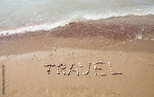 © vadim yerofeyev, Fototapeta premium travel written on sandy beach near sea