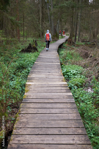 © Kiryl Lis, Fototapeta premium Travel. Young girl traveler with orange backpack and children has a walk on a wooden bridge in nature reserve.