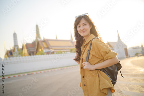 © Jirawatfoto, Fototapeta premium Traveler asian woman in her 30s, backpack slung over her shoulder, explores the intricate details of Wat Pra Kaew with childlike wonder. Sunlight dances on the golden rooftops.