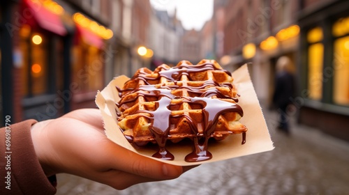Fototapeta premium Traveler enjoys famous local street delicacy - Belgian delectable waffle drizzled with rich chocolate sauce amidst the bustling tourist streets