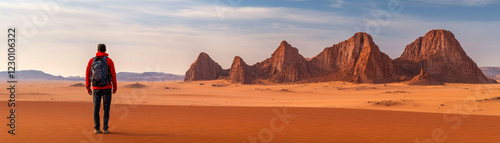 © pawimon, Naklejka premium traveler in red jacket stands on sand dunes, gazing at rocky mountains in desert landscape
