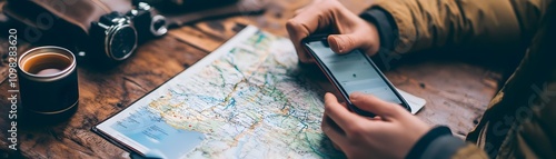© Jojo*, Naklejka premium Traveler Planning Trip Using Map And Smartphone