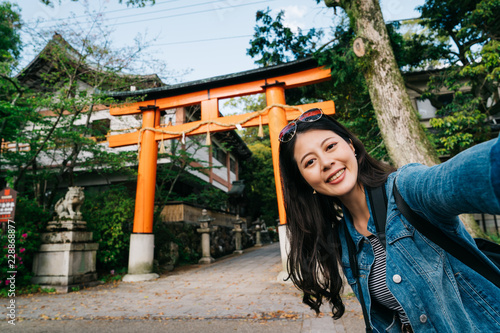 © PR Image Factory, Naklejka premium traveler putting fashion sunglasses on her head