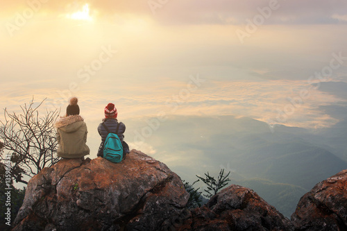 Naklejka premium Traveler sightseeing the beautiful scenery of nature and mist during time the...