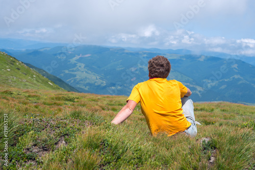 © sanechka, Naklejka premium Traveler sitting on an alpine meadow, among lush grass