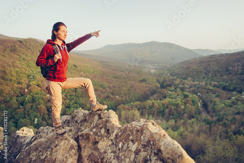 © Alex Photo, Naklejka premium Traveler standing on peak of rock