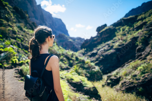 © GVS, Naklejka premium Traveler woman enjoy amazing Masca Gorge valley landscape on Tenerife island