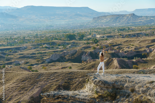 © Leonid, Naklejka premium Traveler woman standing on the edge of sandstone cliffs