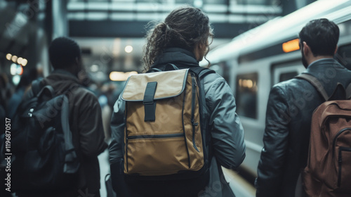 © Mirjana, Fototapeta premium Travelers stand in a busy train station with backpacks and work bags waiting for their transport