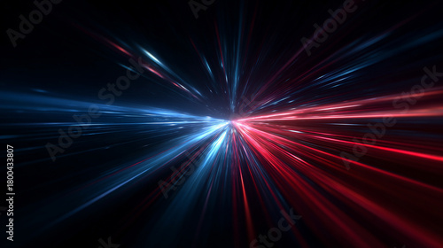 Fototapeta premium Traveling through space and time along blue and red neon rays, with futuristic flying lines, evoking hyperspace, hyperjump, and interstellar exploration.