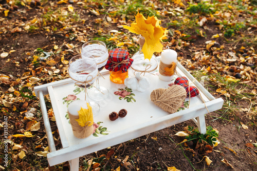 Fototapeta premium tray with a bottle of wine, jam. Autumn decor