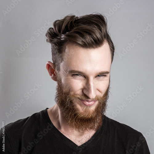 © yurko_gud, Obraz premium Treacherous and crafty young man isolated on gray background