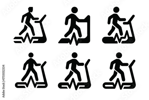 © Svitlana, Naklejka premium Treadmill Logo Variations. A Person Walking on a Treadmill at a Gym, Tracking Their Progress. Set Logo of A Person Walking on a Treadmill at a Gym, Tracking