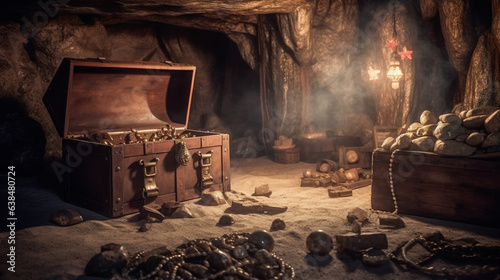 Fototapeta premium Treausre chest in underground cave. AI Geneated