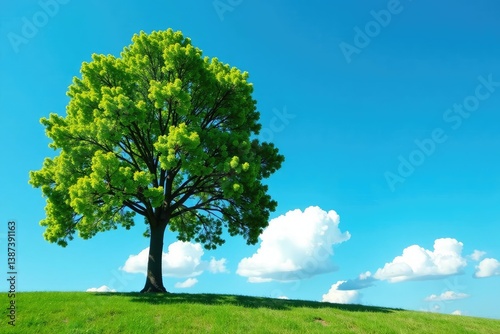 Obraz premium Tree against a bright blue sky with fluffy white clouds, landscape, nature photography, foliage