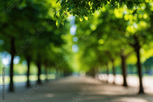 © Andrii Zastrozhnov, Obraz premium Tree alley perspective blurred foreground leaves framed path symmetrical green rows peaceful park vista